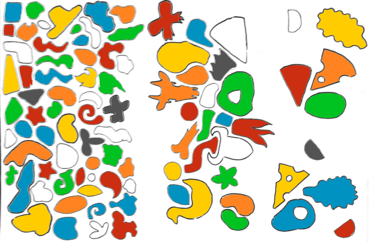 - 300 abstractly (or roughly figurative) shaped, ½ inch thick wooden pieces, divided into three round groups: