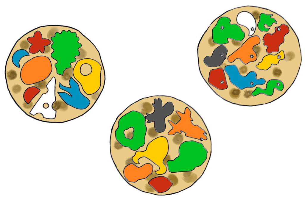 Round 1 uses only the Round 1 ‘rice’ pieces. At the beginning of Round 2, the Round 2 ‘protein’ pieces will be added to the pool, and so on. This keeps the pool wide and varied enough to give plenty of choice.