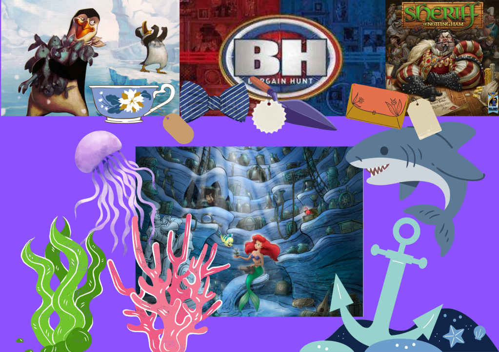 Antiques Roadshark is a bluffing, trading and set-collection card game for 3 – 6 players. Players are sharks operating stalls at an undersea jumble sale, trading, bartering and bluffing as they seek the items that will make them their fortune.