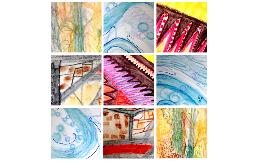 DREAM the WORLD consists largely of square tiles which are illustrated with abstract, dreamlike patterns and images. The feel of the illustration is loose and shifts between strange patterns, surrealist style, and the feel of AI-generated landscapes or abstract satellite imagery.