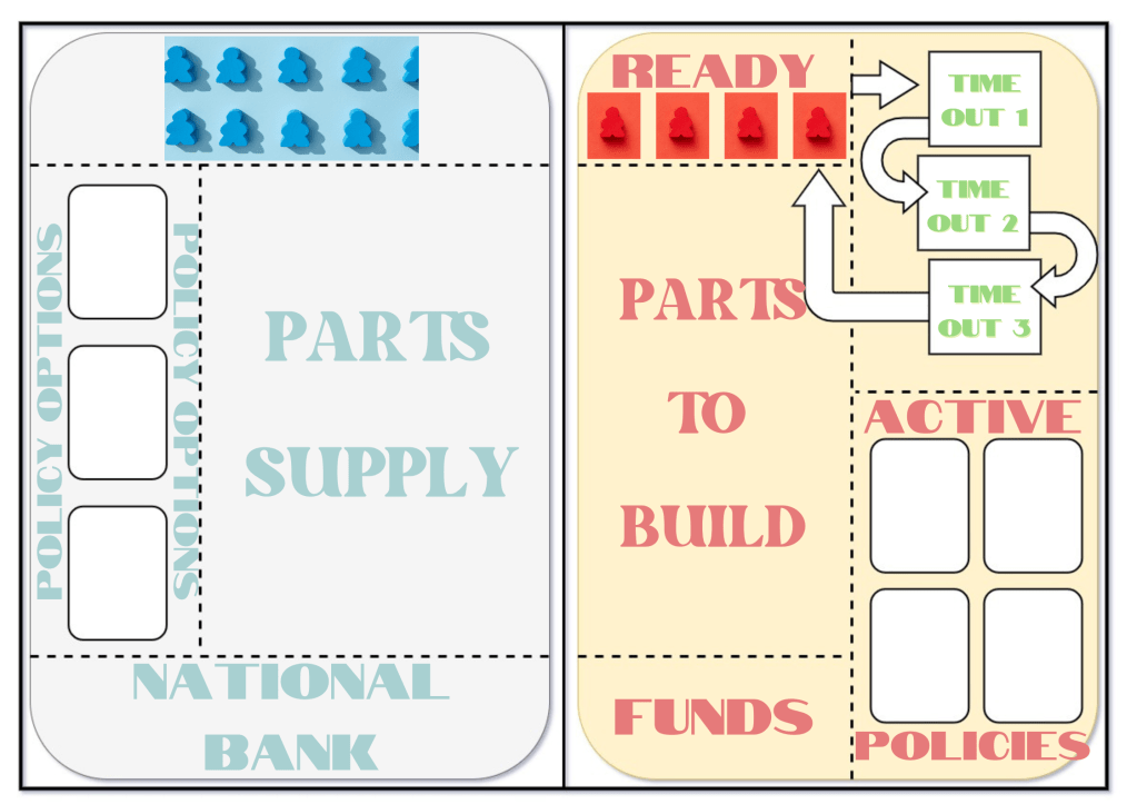 Player mats: The “supply” includes space for inactive Workers, unpurchased Parts, a national Bank, and a display of 3 “policy options”. The “hangar” includes space for current Funds, purchased Parts, and the Worker time-out track and “Ready Room”.